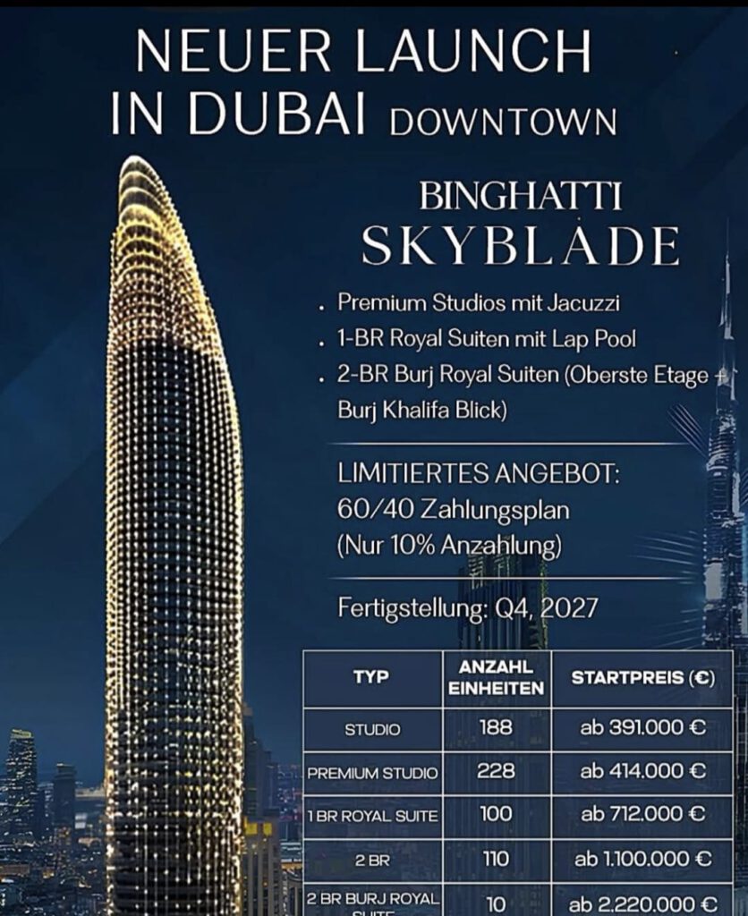 Binghatti Skybalde, der neueste markante Wohnkomplex in Downtown Dubai, ist ein Zeugnis moderner architektonischer Exzellenz. Dieses von Binghatti Developers entwickelte Hochhaus-Meisterwerk bietet atemberaubende Apartments, nur wenige Minuten von der Dubai Mall und dem Burj Khalifa entfernt.